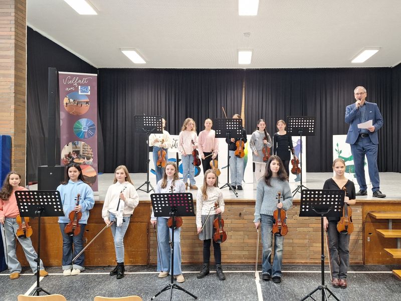Zunächst sorgten die Streicher-AG von Frau Simon und der Wahlunterrichtskurs Darstellendes Spiel von Frau Ludes für einen ansprechenden Start in einen spannenden Vormittag. Nachdem Schulleiter Herr Cimiotti die Anwesenden mit allgemeinen Informationen über das SG versorgt hatte, machten sich die rund 250 Gäste in Kleingruppen auf den Weg, die Schule zu erkunden. Verschiedene Lehrkräfte begleiteten die Touren und hatten Antworten auf sämtliche Fragen parat. Andere empfingen die Gruppen an ihrer Station, die sie zusammen mit engagierten Schülerinnen und Schülern vorbereitet hatten. Zu sehen sind hier einige Einblicke in die Stationen Mathematik, Physik, Informatik, Französisch, Religion, Geographie, Mediathek, Umwelt-AG und Wahlunterricht Präsentieren.