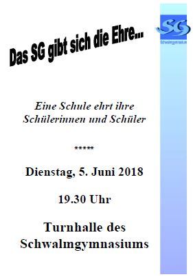 Am Dienstag, den 05. Juni 2018 findet zum fünfzehntenmal Mal die Veranstaltung „Das Schwalmgymnasium gibt sich die Ehre...“ statt. An diesem Abend ehrt unsere Schule Schülerinnen und Schüler, die sich durch besondere Leistungen bzw. besonderes Engagement inner- und außerhalb der Schule hervorgetan haben.