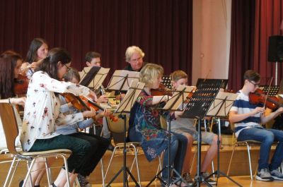 Nun wurde es etwas ruhiger, jedoch nicht weniger imposant. Die Streichergruppe unter Leitung von Esther Wolf und Reiner Eder, trugen verschiedene Stücke von südamerikanischen Tänzen vor. Anschließend betrat eine beeindruckende Gruppe von etwa 40 Personen die Bühne, die den Musizierkreis aus ehemaligen Kollegen und SchülerInnen, Abiturienten und aktuellen Schülern aus der Unter – und Mittelstufe bildeten. Diese spielten unter Leitung von Reiner Eder die Feuerwerksmusik von Georg Friedrich Händel, sowie Schubert und Mendelsohn.