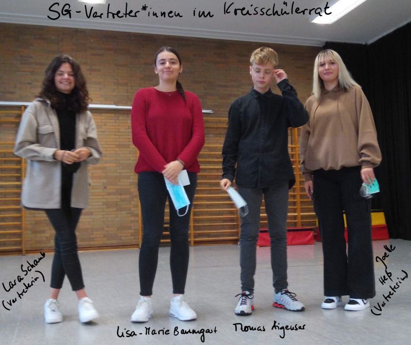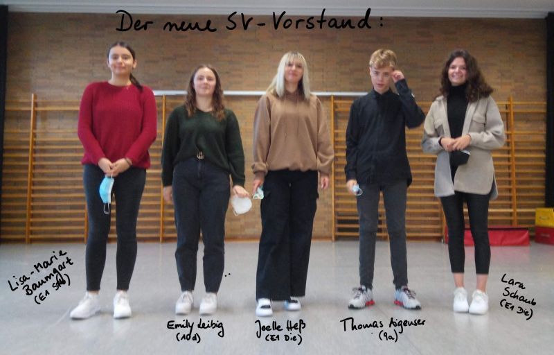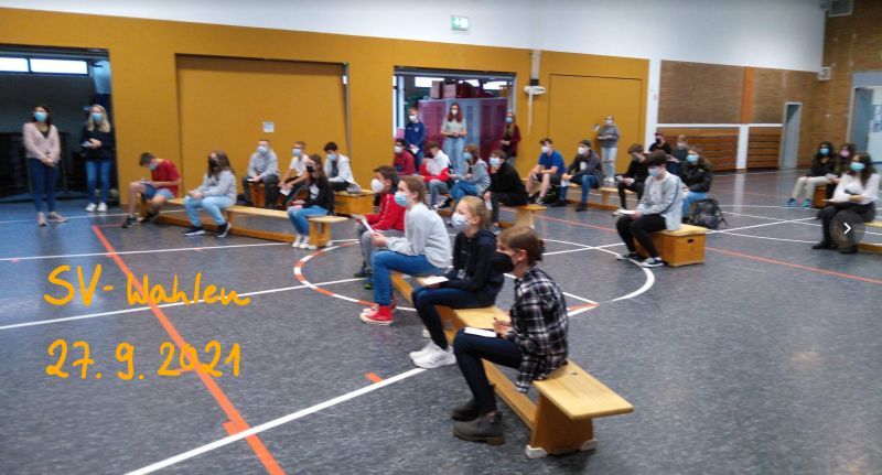 Am 27. September 2021 fanden die diesjährigen SV-Wahlen statt. Die Klassensprecherinnen und Klassensprecher wählten in der Turnhalle - mit Masken und genügend Abstand - die neuen Schulsprecherinnen, den SV-Vorstand sowie Vertreter*innen für die Schulkonferenz und den Kreisschülerrat. Die neue SV trifft sich montags in der 30-Minuten-Pause im Musiksaal - kommt vorbei, wenn ihr Fragen habt oder Lust, bei SV-Projekten mitzumachen!