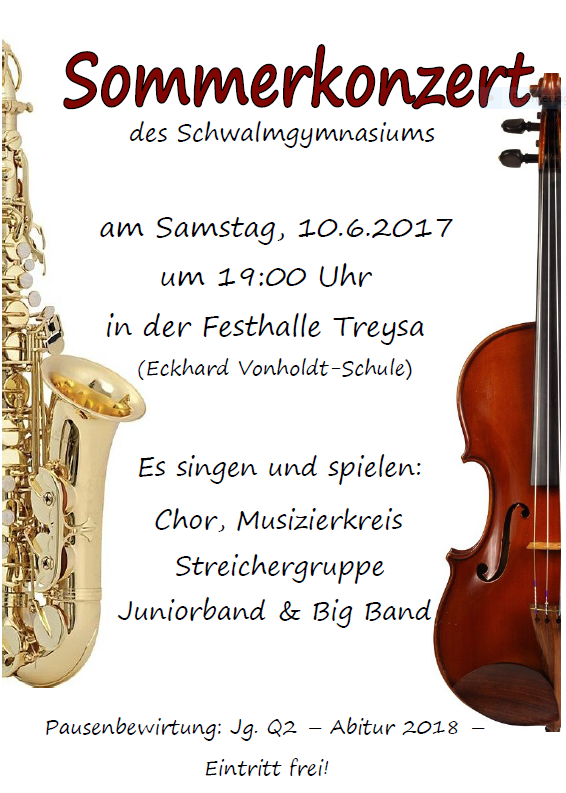 In diesem Schuljahr findet am Samstag, den 10. Juni ein großes Schulkonzert in der Festhalle (Eckart-Vonholdt-Schule, neben dem Europabad) statt, das die ganze Bandbreite der musikalischen Arbeit am Schwalmgymnasium umfasst. Anders als in den vorangegangenen Jahren gibt es nicht mehrere Einzelveranstaltungen sondern ein zentrales Ereignis. Dieses Konzert soll ein musikalisches Fest werden. Dazu haben die musikalischen Gruppen ein anspruchsvolles und umfangreiches Programm einstudiert. Das Orchester führt unter anderem den 1. Satz aus dem Violinkonzert von Felix Mendelssohn (mit der jungen Solistin Siri Eder) und Werke von Schubert und Händel auf. Die Big Band wird im zweiten Teil des Programms mit einer Mischung aus Swing, Jazz-Rock und Filmmusik aufwarten. Der Chor hält interessante Arrangements aus dem Bereich der Pop-Musik bereit, um das Publikum zu unterhalten. Dazu kommen die Auftritte der Streichergruppe und der Junior Band, die nach einem Jahr erfolgreicher Arbeit ihre Ergebnisse präsentieren wollen.