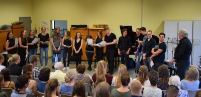 Die Streicher, die Mazas, Mozart und Bach spielten, wurden beispielsweise abgelöst vom 1964er „House of the rising sun“. Auch der „Fast- Beitrag“ für die Kasseler Musiktage zeigte einmal mehr, dass klassische Musik sehr gut zu Blasmusik passt – ruhige Streicher vs. Bläser mit Schlagzeugbegleitung, machten gute Laune und erzeugten den Wunsch, mehr davon hören zu wollen. Und das Publikum bekam mehr – zum Musikleistungskurs gehört nämlich nicht nur das Spielen von Instrumenten, sondern auch ein Gesangskurs, der sich als A capella Chor entpuppte und Lieder wie „Only You“, „For the longest time“ oder „Falling in love“ zum Besten gab. Besonders beeindruckend war auch der Blues, der zuvor von Andreas Fiebig als „wenig geübt“ und teils „improvisiert“ angekündigt wurde. Für einen Laien wie mich klang dies jedoch äußerst professionell und auch das Publikum bedankte sich mit Pfiffen und enthusiastischem Applaus.